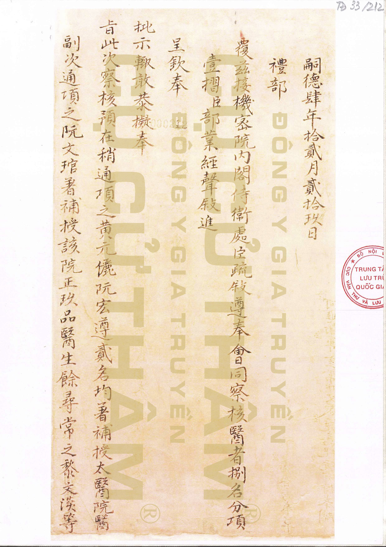 Tài liệu nói về việc Ngự Y Hoàng Nguyên Lễ là người đỗ cao nhất trong kì thi tuyển vào Thái Y Viện, được lưu trữ tại Trung tâm lưu trữ quốc gia I